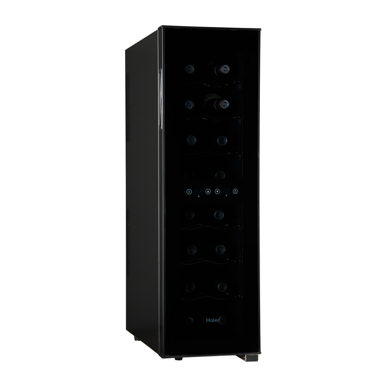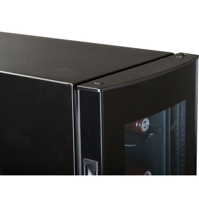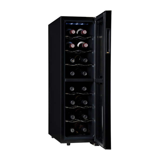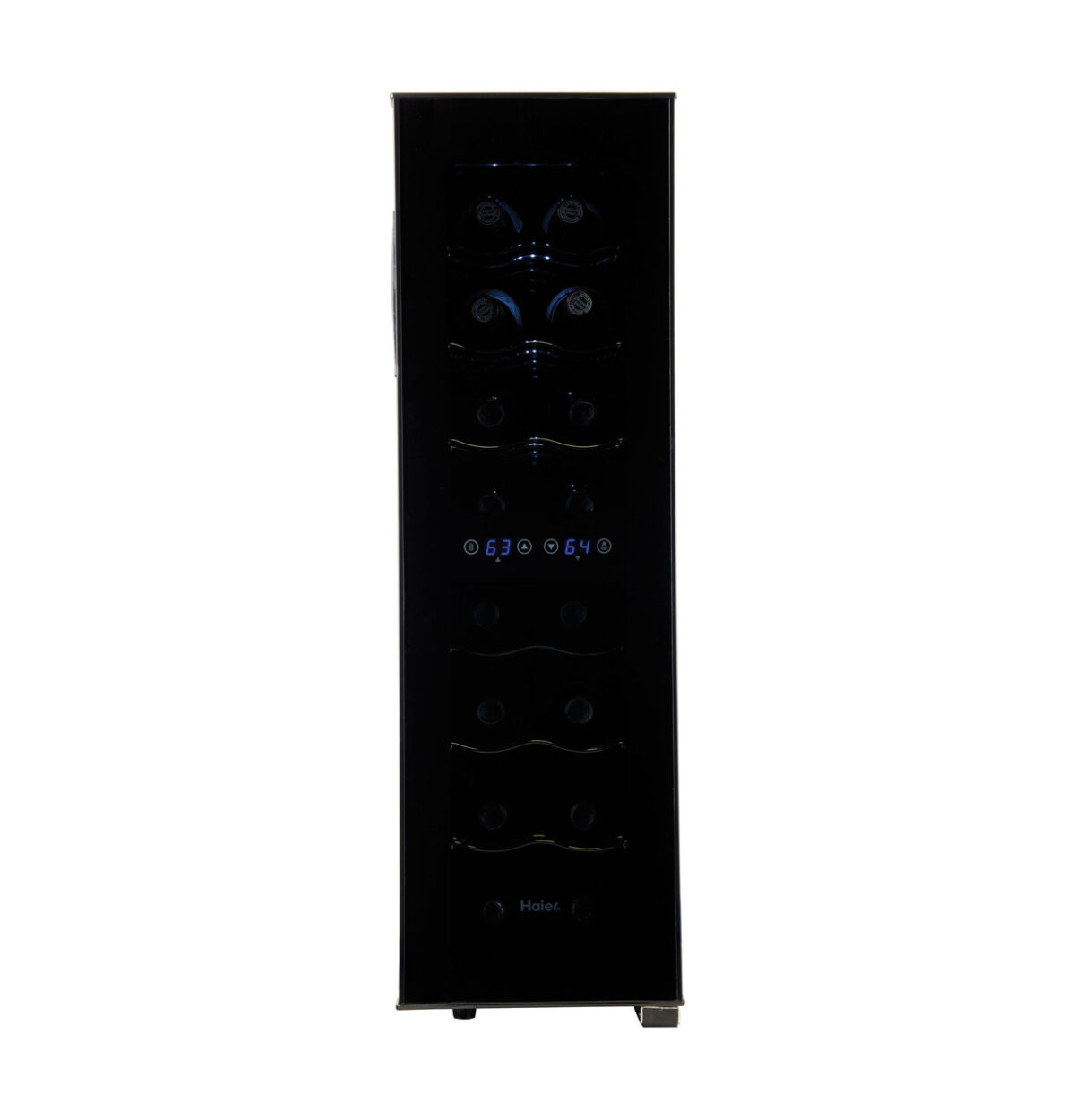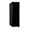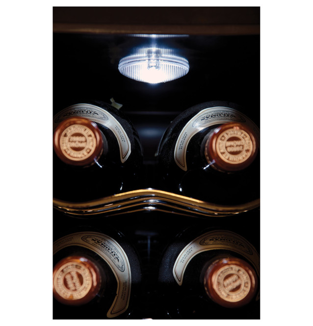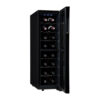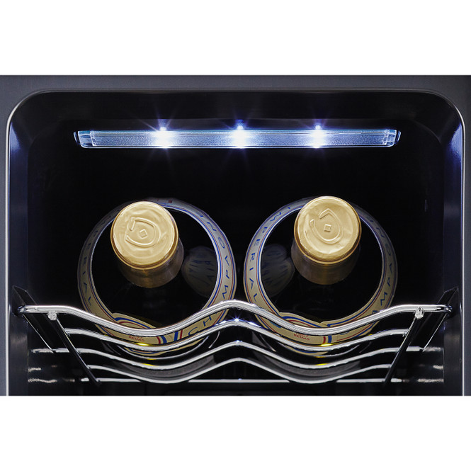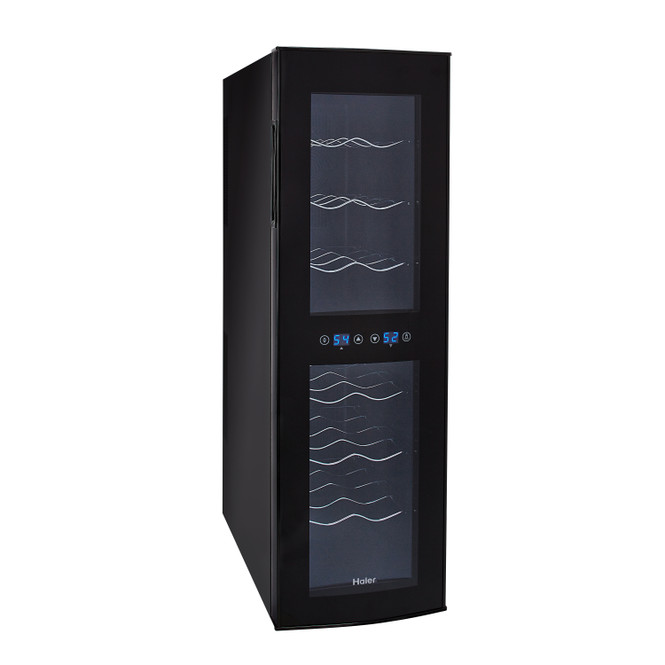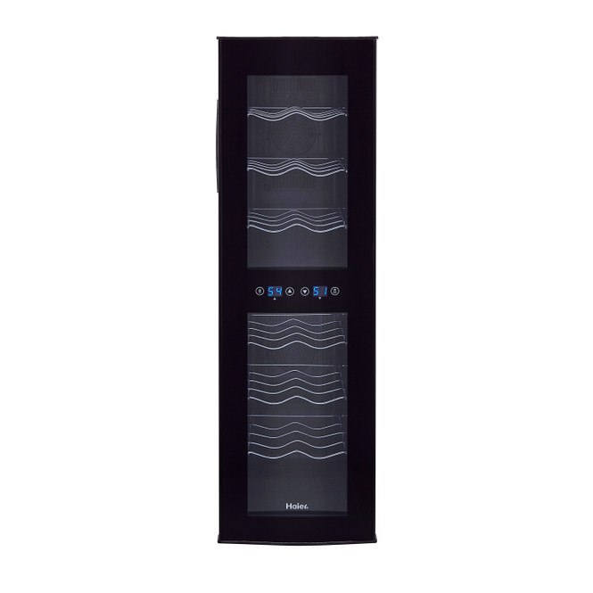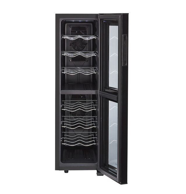 This 16-bottle dual-zone wine cellar offers advanced thermoelectric cooling for ultra-quiet, vibration-free operation—ideal for preserving wine quality. With independent temperature controls, the upper zone ranges from 54–66°F and the lower from 42–66°F, allowing optimal storage for both red and white wines. Its modern design features a curved smoked glass door, black trim, and a sleek black cabinet that complements any space. Dual touchscreen controls with two LED displays make it easy to monitor and adjust temperatures. Soft interior lighting adds elegance while helping you easily view your collection. Equipped with six full-width chrome storage racks, this wine cellar securely holds up to 16 bottles. Perfect for kitchens, bars, or wine rooms, it blends functionality and style, ensuring your wines are stored in the best possible conditions.