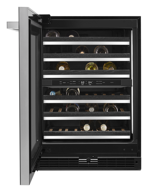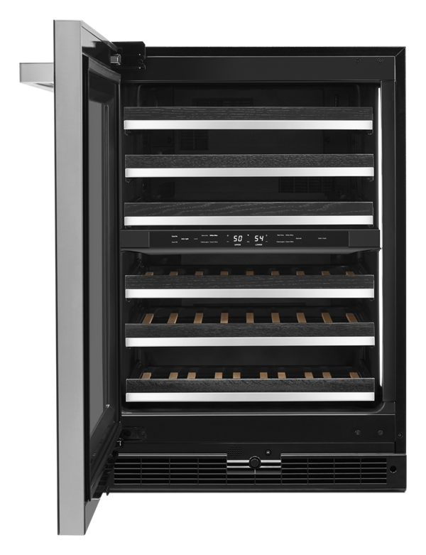 This 24″ Built-In Undercounter Wine Cellar is a perfect blend of sophistication and functionality, designed to enhance any modern living space. Featuring a sleek left swing door and a daring obsidian interior, it offers an elegant way to store and display your wine collection. With a capacity to hold up to 45 bottles, this wine cellar features independent temperature zones, allowing you to store different types of wines at their ideal temperatures for optimal aging. The UV-resistant thermal glass door protects your wine from harmful light exposure, ensuring your bottles remain in perfect condition. The marquee lighting illuminates every bottle, showcasing your private reserve in a stunning, eye-catching way. This wine cellar is not only a practical solution for wine storage but also a luxurious addition to your home, bringing both style and precision to your wine experience.