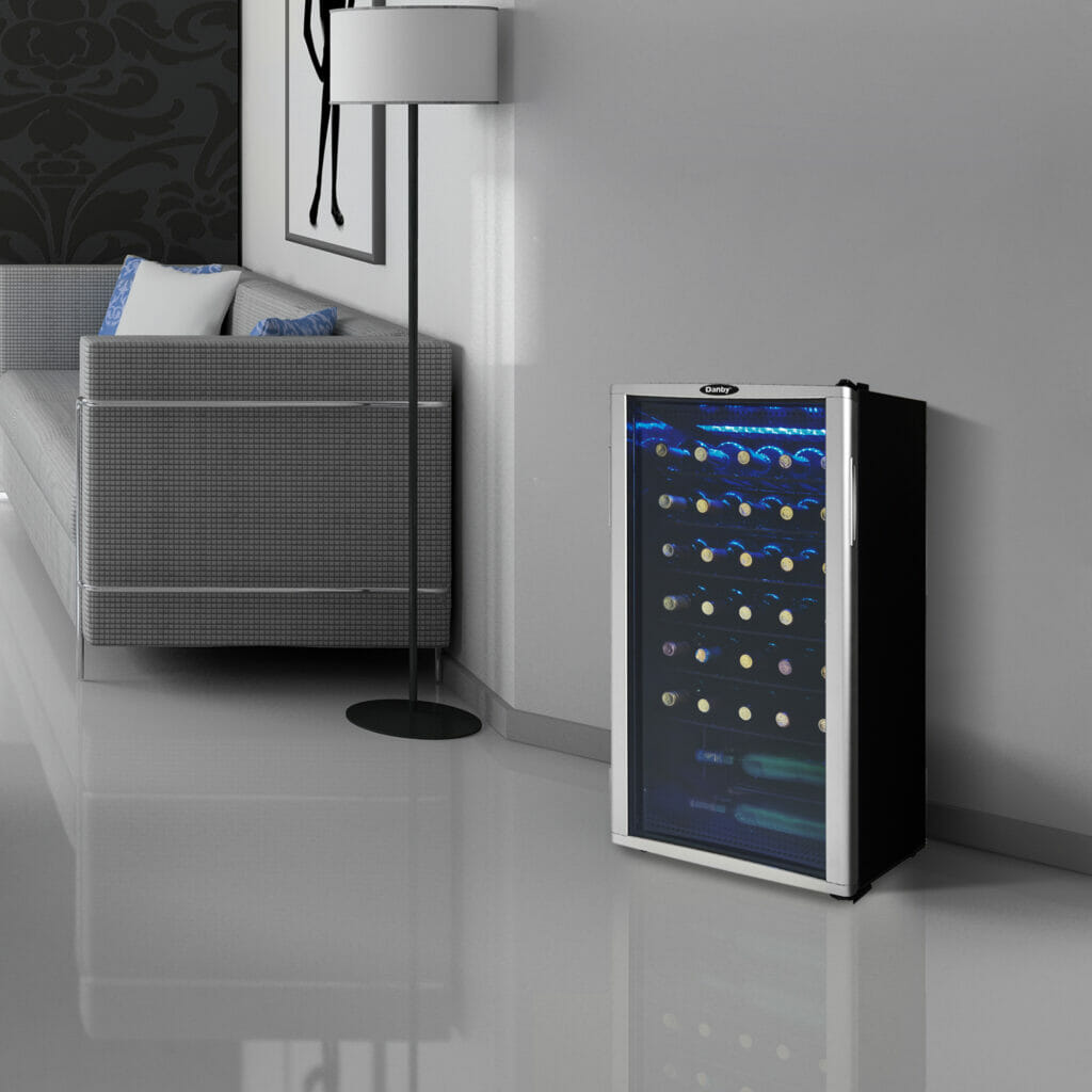 Your favorite white or red wines will have a fine home in this superior free-standing wine cooler designed to cool up to 36 bottles of wine. Danby’s 3.2 cu. ft. wine chiller is a stylish and sophisticated addition to your kitchen, bar, restaurant, or café. The bright LED interior-light display is perfect for showmanship, ensuring you can find the next bottle you’ll indulge in easily. Your wine collection is well protected due to the attractive shatter-resistant tempered glass door trimmed in platinum. Features include a convenient automatic-defrosting system and five removable strong black storage shelves. In addition, the thermostat allows you to easily program and maintain the internal temperature anywhere between 42.8°F – 57.2°F (6°C – 14°C). Plus, it comes with a reversible door swing allowing you to open it from the left or right-hand side depending on your preference.