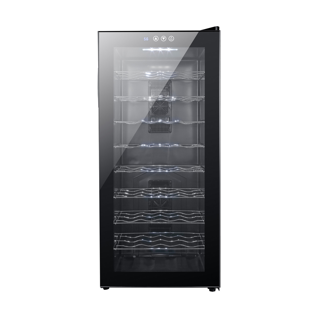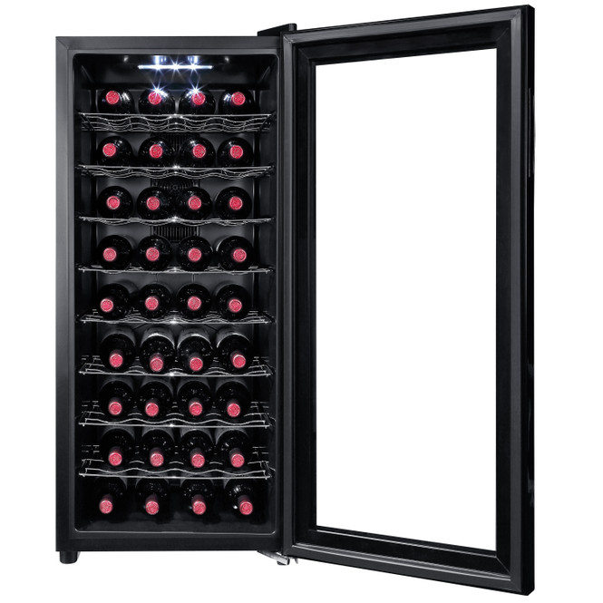 The 36-Bottle Wine Cellar is the perfect choice for wine enthusiasts, offering an elegant and efficient way to store your collection. It features a sleek glass door and a user-friendly touch screen control panel with an LED display. The temperature is easily adjustable between 50–66°F, making it suitable for both red and white wines. The thermoelectric cooling system ensures vibration-free and ultra-quiet operation, preserving your wines in ideal conditions without any noise or disruption. Soft interior lighting not only adds to the aesthetic appeal but also helps you organize and view your collection with ease. The LED electronic control display allows precise temperature adjustments in one-degree increments, ensuring optimal storage. Combining modern design with advanced cooling technology, this wine cellar offers both style and functionality, making it the perfect addition to any wine lover’s home.