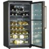This 40-bottle capacity dual zone wine cellar is stylish as well as durable with a heavy duty brushed metal handle and sturdy worktop. Two separate storage compartments with their own adjustable electronic temperature controls and LED temperature displays provide the perfect solution for keeping both red and white wine at ideal temperatures in the same unit. The double pane tinted glass door further protects your collection from the effects of the outside environment. Five full-depth chrome wire storage racks and two half-depth racks can store up to 40 bottles of your favorites. This unit is quiet-operating and provides a vibration-safe environment for wines.
