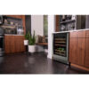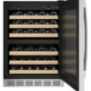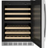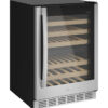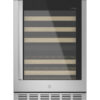 The 44-Bottle Dual Zone Wine Cooler combines modern design with functionality, featuring a sleek glass door with stainless steel trim and handle, complementing any kitchen décor. It offers dual-zone temperature control, keeping red and white wines at ideal serving temperatures from 43ºF to 62ºF. Six sliding racks with wooden fronts allow easy access to bottles, while recessed LED lighting ensures clear visibility. Designed for both built-in and freestanding installation, it fits seamlessly into any space. The cooler features a 44-bottle capacity, a triple-pane glass door for enhanced temperature stability and energy efficiency, and digital controls for precise adjustments. The tinted glass door and door alarm prevent energy waste, while power buttons make it easy to operate the unit and lighting, ensuring both convenience and efficiency.