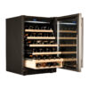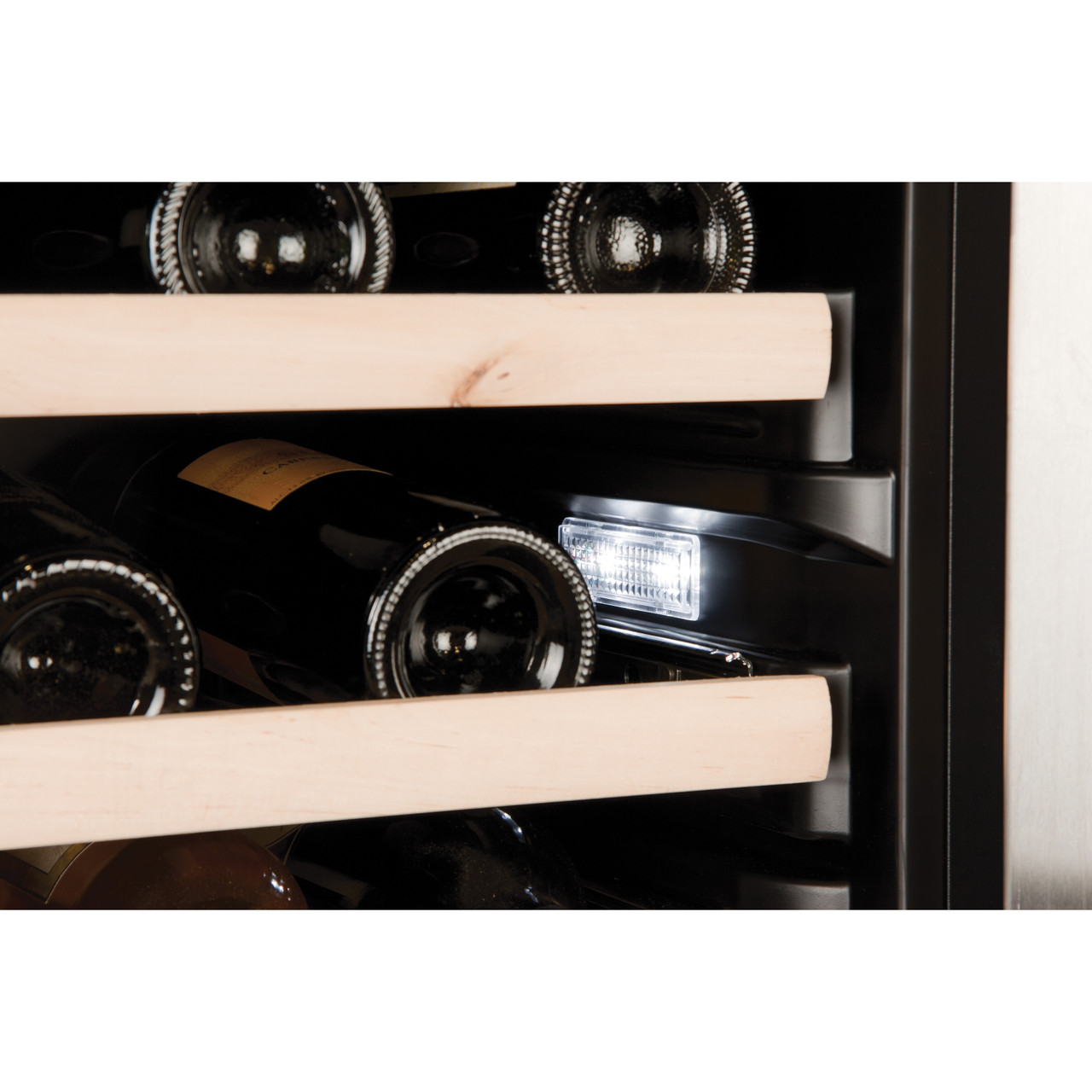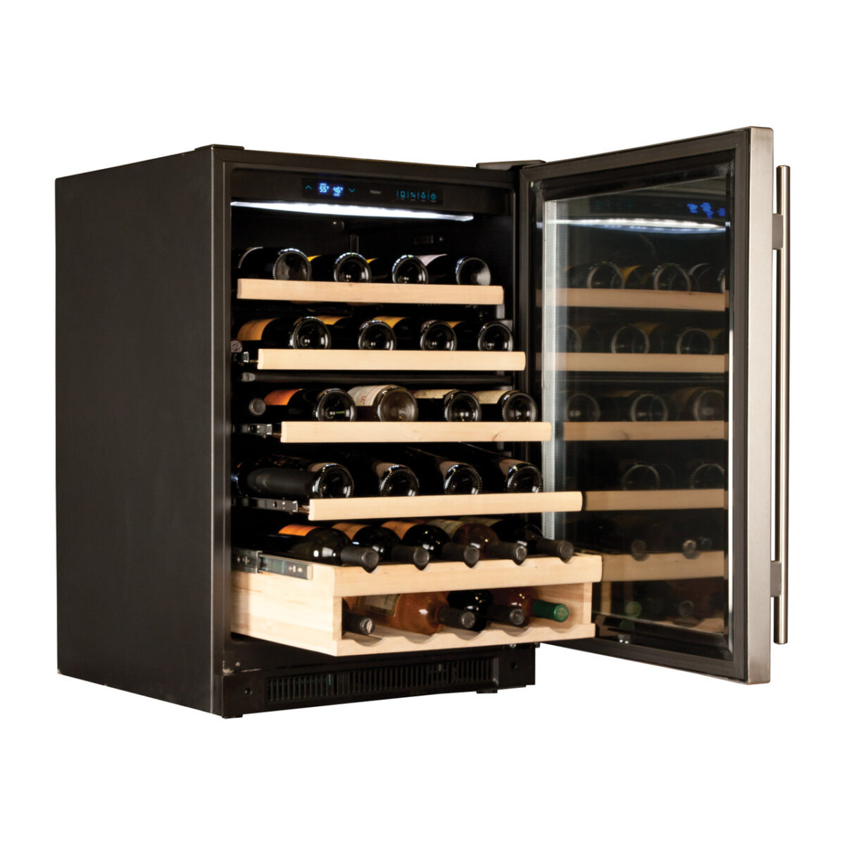 This 48-bottle wine cooler combines style and functionality with a sleek stainless steel door and a 3/4″ pro-style handle. It features soft lighting with auto/manual control to create a customizable ambiance. The unit includes four glide-out shelves with wood trim and a glide-out storage basket for easy wine access. The reversible door allows flexible installation, and electronic controls offer both Celsius and Fahrenheit options. Sabbath mode functionality ensures compliance with Sabbath-observing practices. The dual-zone temperature management system includes a movable divider, allowing independent control of the upper (50°F–65°F) and lower (43°F–65°F) zones, keeping red and white wines at their ideal temperature. Perfect for wine enthusiasts, this cooler maintains the ideal conditions for preserving and showcasing your wine collection.