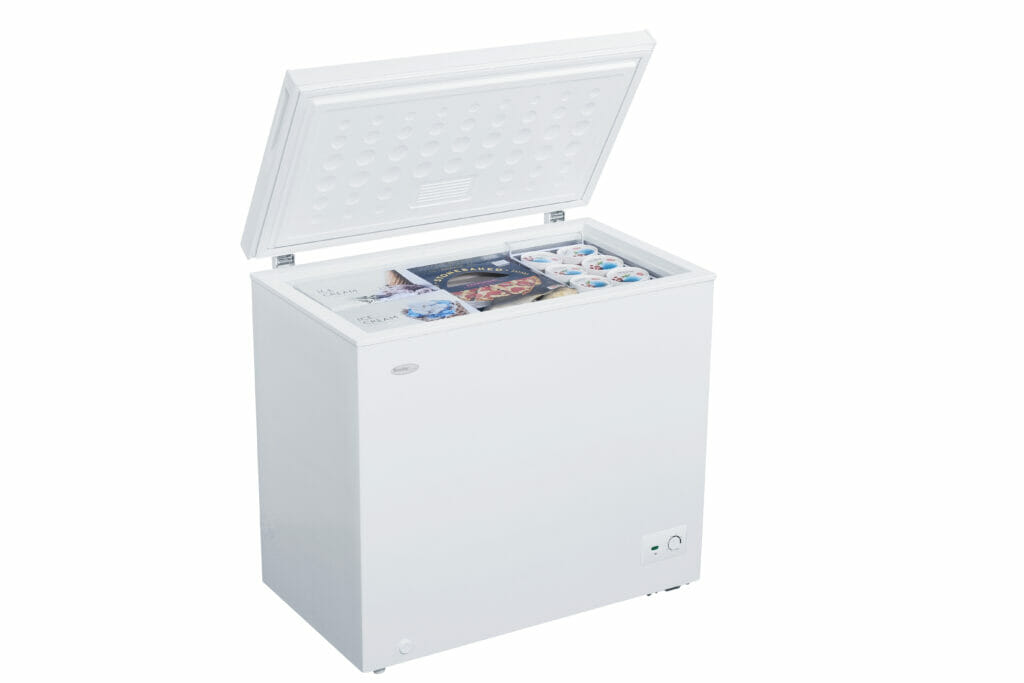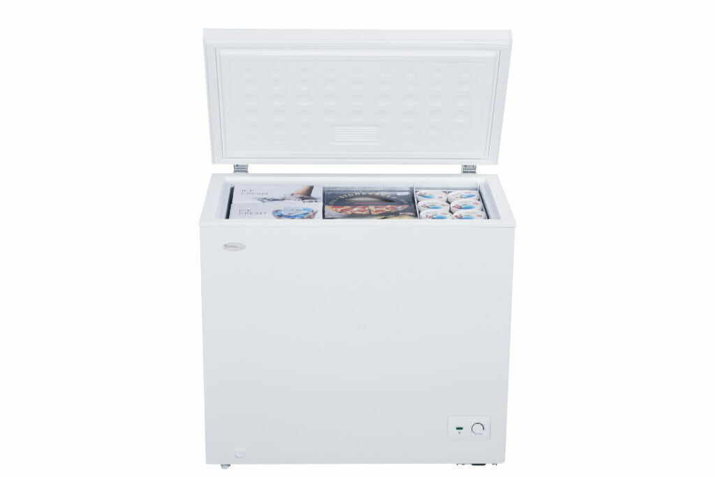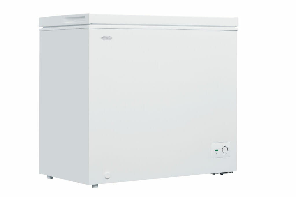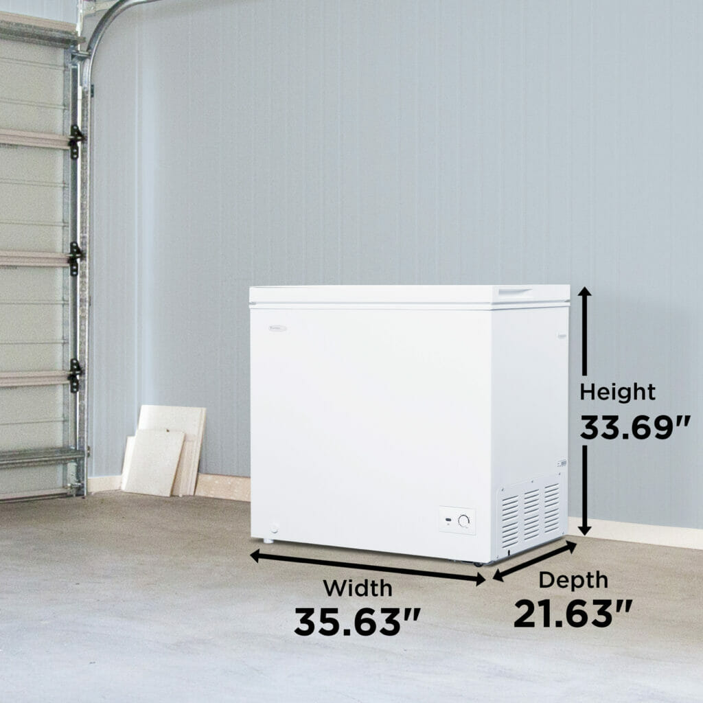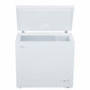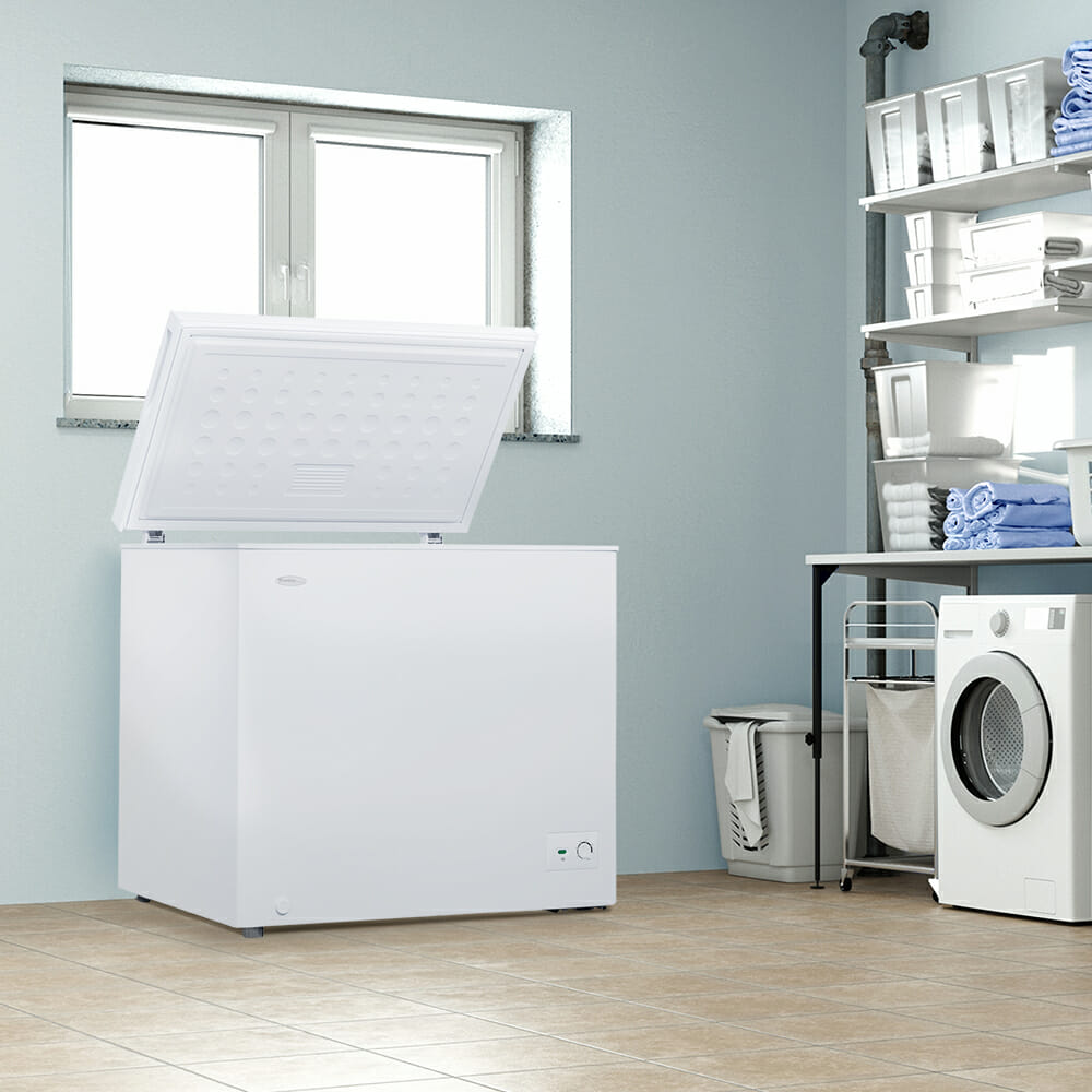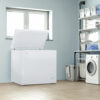 7.0 cu. ft. Chest Freezer in White offers extra storage for bulk frozen items, making it ideal for basements, kitchens, or garages. Despite its compact design, it provides a generous 7.0 cu. ft. (197 L) of freezer space, perfect for small families or couples. This freezer is garage ready, performing efficiently in temperatures ranging from 0°F to 110°F (-17°C to 43°C). The foam-insulated cabinet and lid maintain internal temperatures, minimizing energy consumption. It features a front-mounted mechanical thermostat for easy control and a front drain for quick defrosting. The interior is designed for easy cleaning, while two rear rollers make it easy to move. A wire storage basket helps organize smaller, frequently used items, keeping your frozen foods neatly stored and easily accessible.