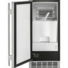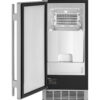 This built-in ice machine offers versatile installation options, allowing it to be placed in cabinetry or used as a freestanding unit. It features a high-capacity output, producing 50 pounds of semi-clear ice per day, and comes with a spacious storage bin that holds up to 25 pounds of ice. The unit also includes a reversible door, providing flexibility to change the swing direction for right or left use based on your space requirements. Additionally, it is equipped with an electronic cleaning cycle, making maintenance convenient and ensuring the ice machine operates efficiently.